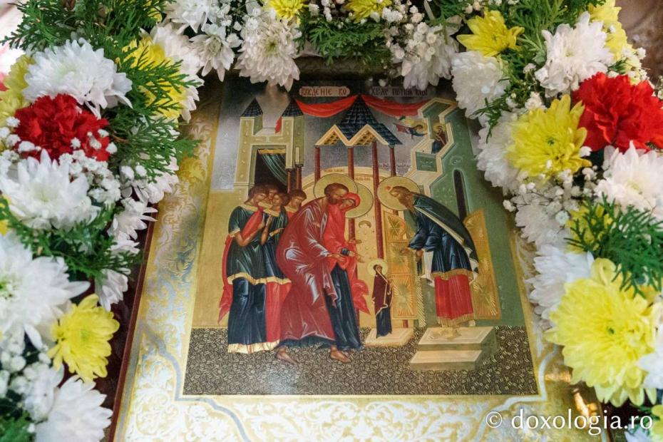 Această mare taină a prezenței lui Dumnezeu în viața omului a fost împlinită cu desăvârșire de Preasfânta Născătoare de Dumnezeu, care L-a primit pe Domnul Hristos în pântecele său prin adumbrirea Duhului Sfânt, fiind pregătită în mod special pentru aceasta prin intrarea ei în templul din Ierusalim, clipă binecuvântată pe care o prăznuim și noi astăzi.